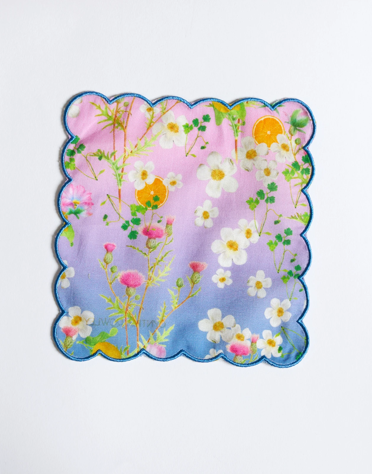 Printed cottonĀ cocktail napkins with scallop embroidered edge.Ā