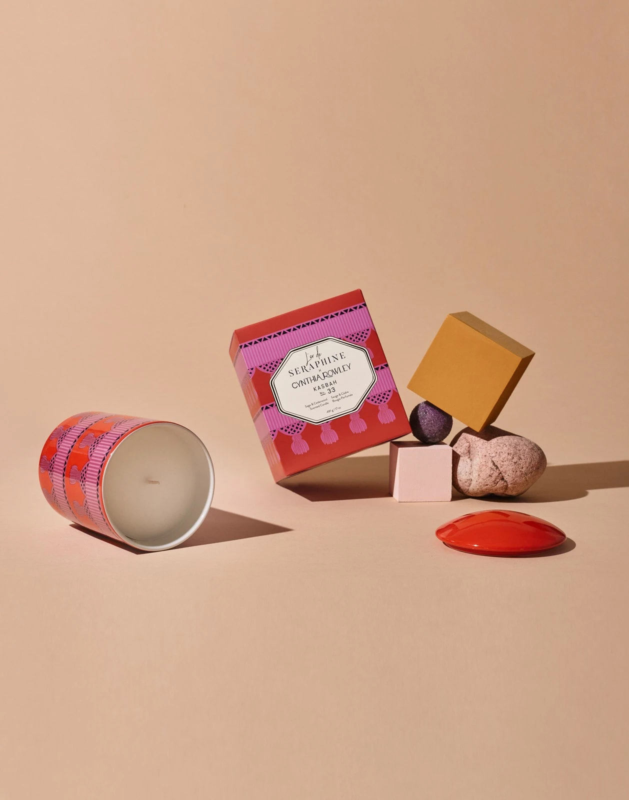With its elegant pink tassels layered on bold red horizons, Kasbah will transport you to an exotic locale with the woody-meets-grounding fragrance No. 33, of sage, cedarwood, and eucalyptus.Â