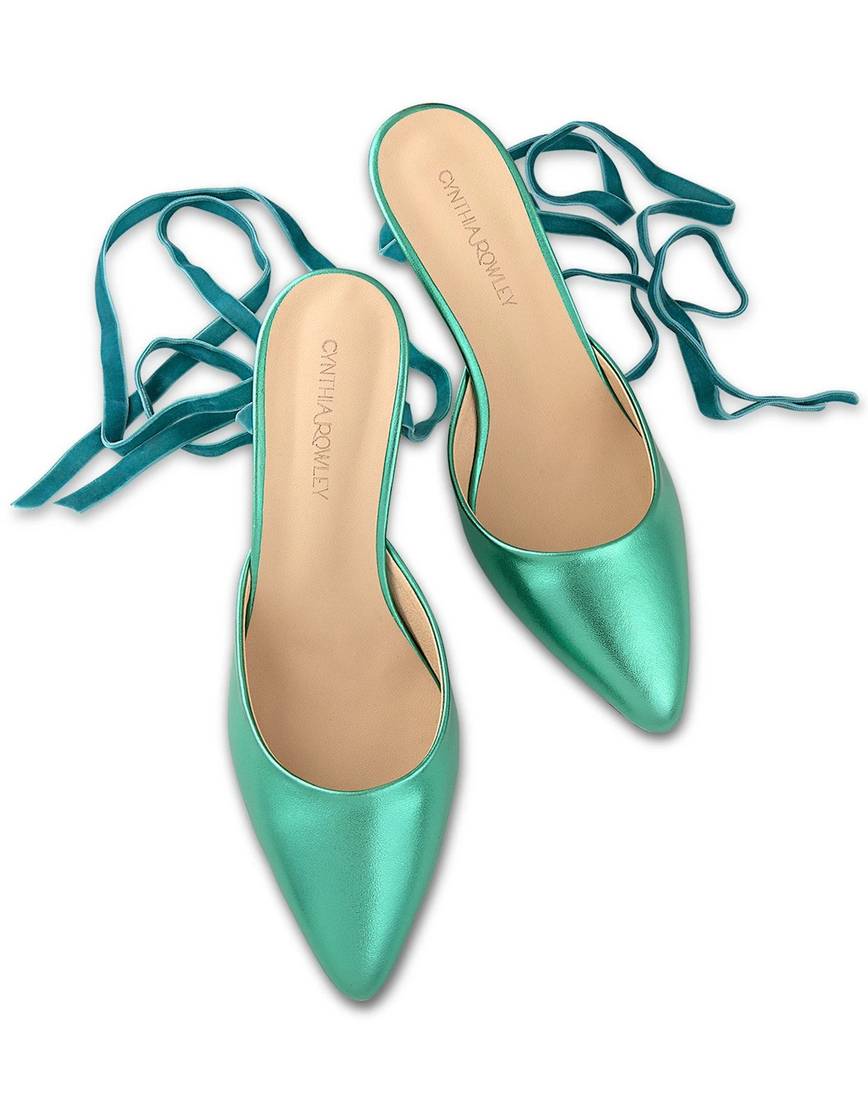 Emerald metallic wedge with velvet ribbon tie.