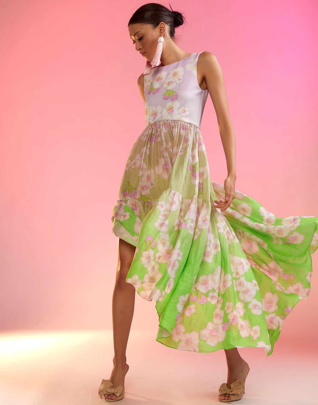 The Ultimate Pretty Meets Sporty! Floral high/low tier dress with bonded tank and cotton skirt.